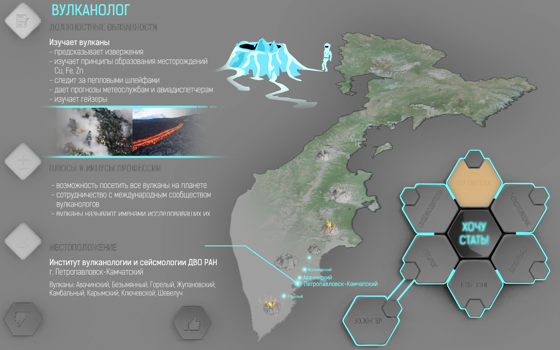 Интерактивный интерфейс: пользователь может выбрать одну из представленных профессий (геолог, эколог, моряк, инженер, повар, и т.д.), используя сенсорный экран или жестовое управление (в зависимости от версии стенда).